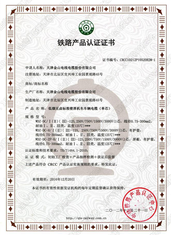 天津菠萝导航在线观看電線電纜股份有限公司鐵路機車車輛用電線電纜CRCC認證證書下載,TB/1484-2010標準機車車輛電纜WDZ-DC/III WDZ-DC-H/III WDZ-DC-ZP-H/III電線電纜CRCC認證。